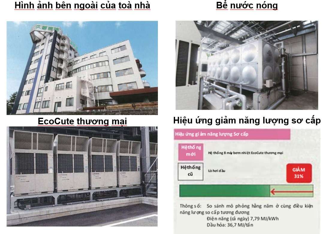 Một bệnh viện ở tỉnh Ishikawa, có diện tích 11.665 m2, 199 giường (Hình 2), hoạt động từ năm 1970, đã lắp đặt các máy bơm nhiệt EcoCute thương mại có tổng công suất 240 kW (30kW × 8 máy) và bể chứa 32m3 để thay thế các nồi hơi đốt dầu với mục đích giảm chi phí vận hành. Kết quả của việc thay thế này là tiêu thụ năng lượng sơ cấp đã giảm khoảng 31%.